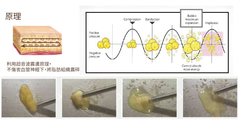 最大特點之一是利用超音波快速震盪作用,在不會傷害神經和血管的條件下將脂肪細胞膜碎解,使之快速 成為乳靡狀,再利用1.2mm、1.9mm和2.9mm三種不同管徑的吸管將已乳化成液態的脂肪吸出體 外,對神經、血管的傷害降低許多。