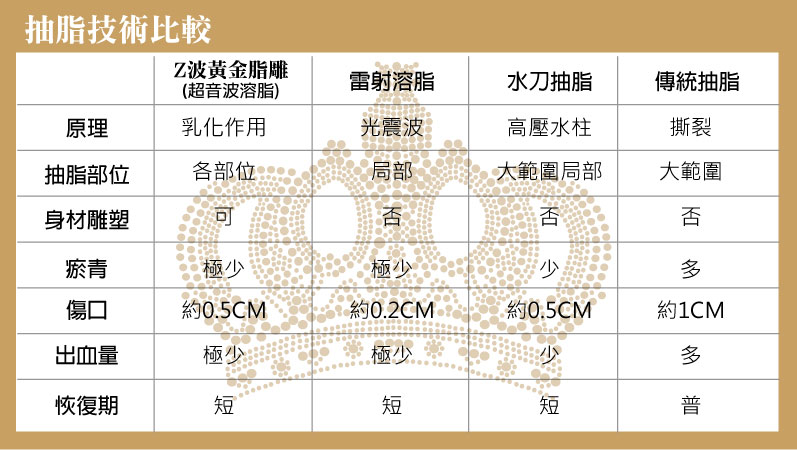 ultra z(Ultra-Z can beused only lipoplasty)其中文名稱為『捷洛恩』超音波外科設備,核定醫器次類別為I5040抽脂機。 ,有效破壞脂肪細胞,卻不會傷害 神經、肌肉、血管,探針開口小於0.5公分,溶脂後再以吸脂術將溶解後的脂肪液抽出,完成抽脂 及身材雕塑的目標,加上Z波黃金脂雕複合式的雷射熱效應,不止雕塑身材,皮膚還能緊緻並保有彈性。